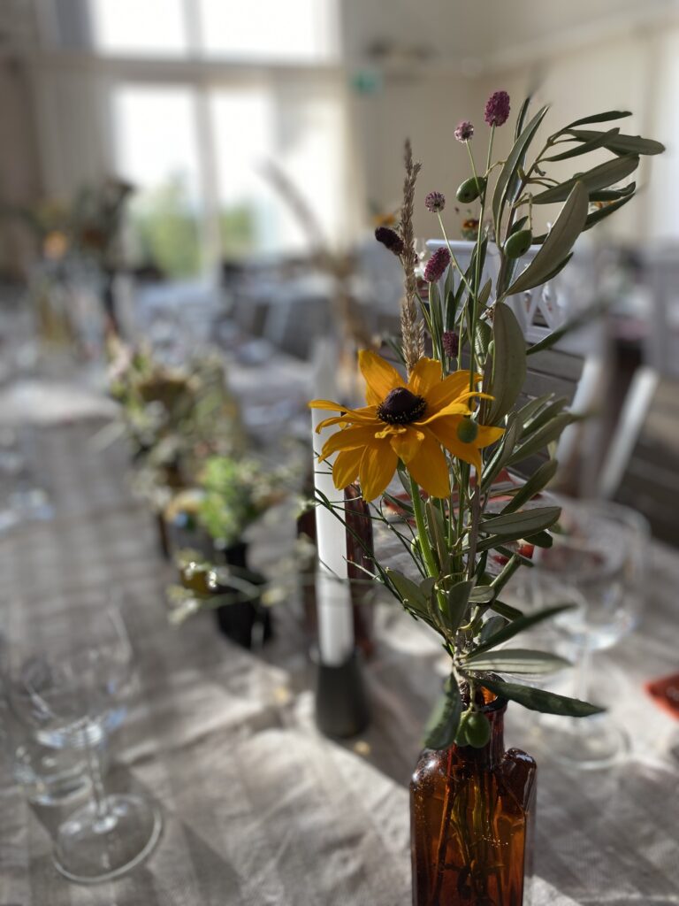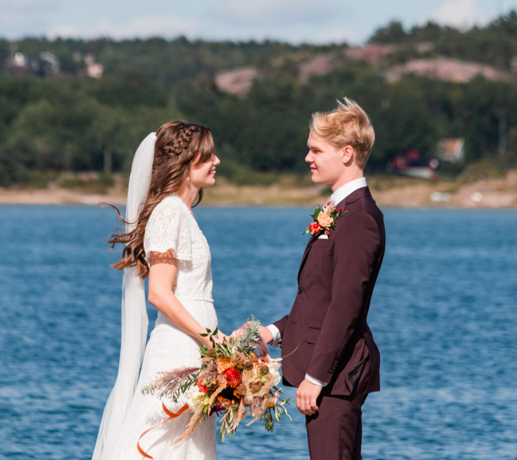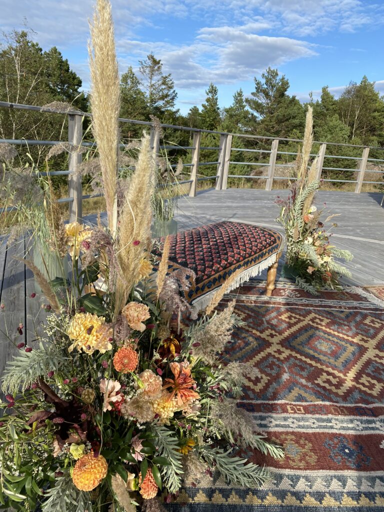 Bohemiskt skärgårdsbröllop i varma sensommartoner. Jonna ville ha mycket färger som gick ton i ton och färgskalan skulle vara varma färger. I dukningen användes bruna glasflaskor som vaser och detta lyfte verkligen blommorna. Blommorna var delvis köpta hos grossist men nästan de mesta av blommorna plockades på självplock för att verkligen få fram säsongens blommor!